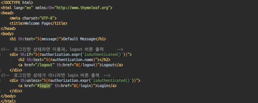 - 1.만약 인증된 상태라면 인증객체에서 name값 (인증된 사용자의 이름) 을 꺼내와 Logout버튼과 함께 출력한다.