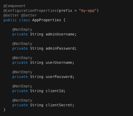 - 기존 설정들을 외부설정으로 대체하기 위해 AppProperties 클래스를 생성한다.