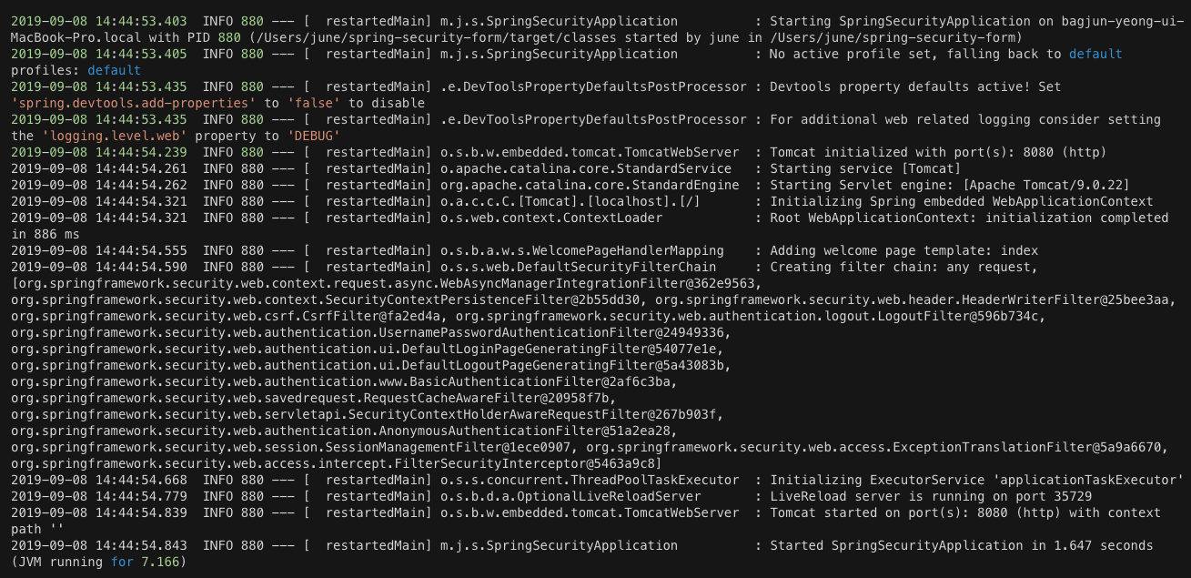 설정을 진행하고 난뒤 다시 스프링부트 애플리케이션을 실행하면, 이전과는 달리 패스워드가 자동설정되던 Log가 없다.